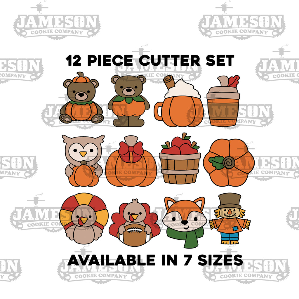 This is an 12 piece cookie cutter set (Bear Pumpkin Costume 1, Bear Pumpkin Costume 2, Pumpkin Coffee, Fall Coffee, Owl, Pumpkin Bow, Apple Basket, Pumpkin Top, Turkey, Turkey Football, Fox, Scarecrow)
